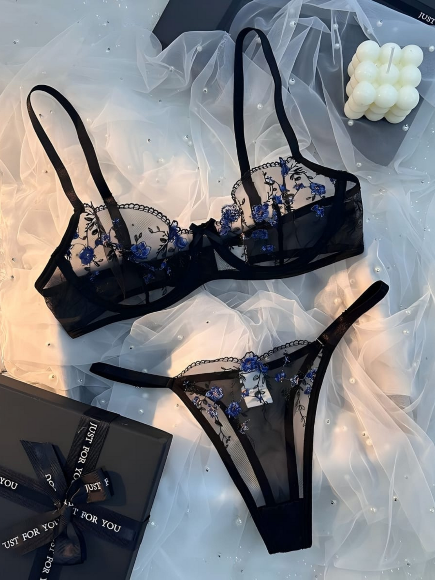 Aurèale – Coordinato lingerie nero con ricami floreali blu notte